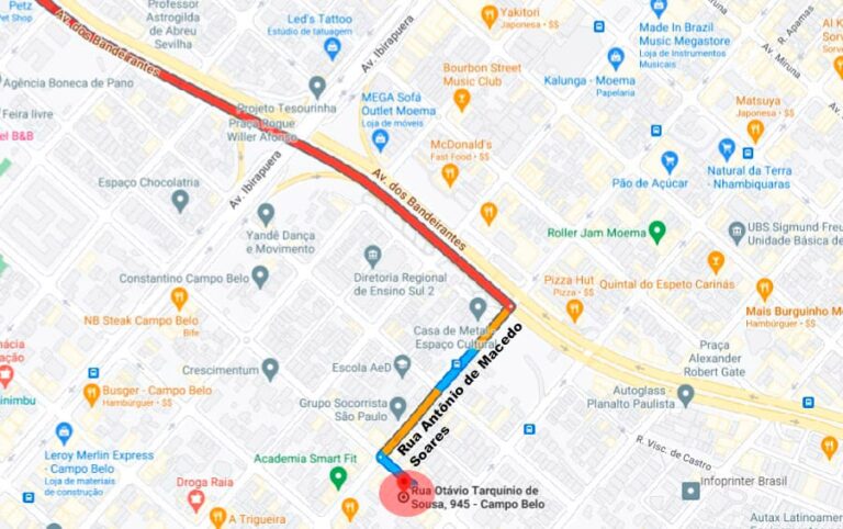 Seguindo pela Av. dos Bandeirantes sentido Imigrantes, depois de cruzar a Avenida Santo Amaro e a Avenida Ibirapuera, permaneça a sua direita, no próximo semáforo, vire a direita na Rua Antônio de Macedo Soares, siga até a rotatória e entre sua esquerda na rua Rua Otávio Tarquínio de Sousa e siga até o número 945.